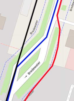 Il itinerario originale verrà sempre mostrato in nero. In questo esempio, la linea nera è il modo in cui la mappa HERE mostra il itinerario. Il confronto è stato poi effettuato sia con la mappa OSM che con la mappa TomTom. La mappa TomTom è la linea rossa e la mappa OSM è la linea blu.